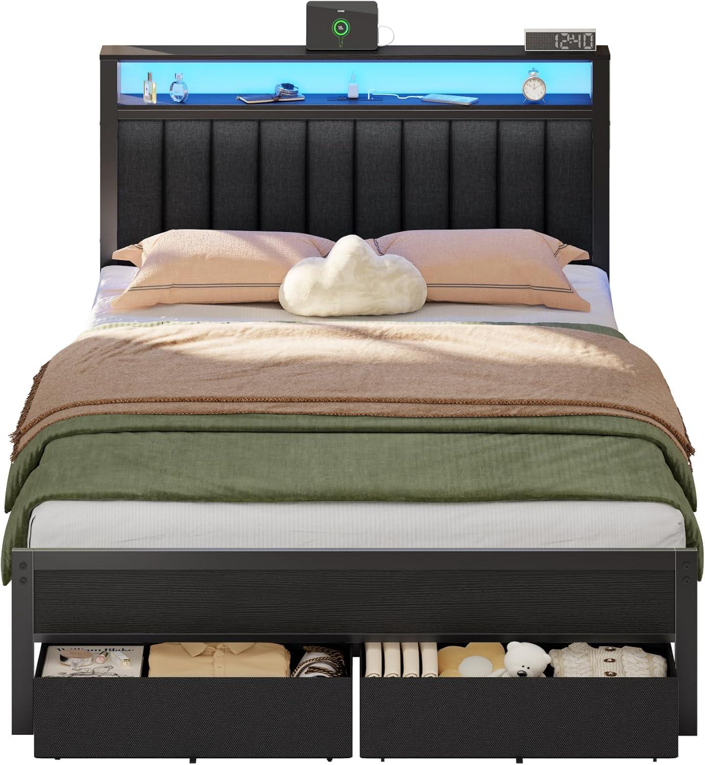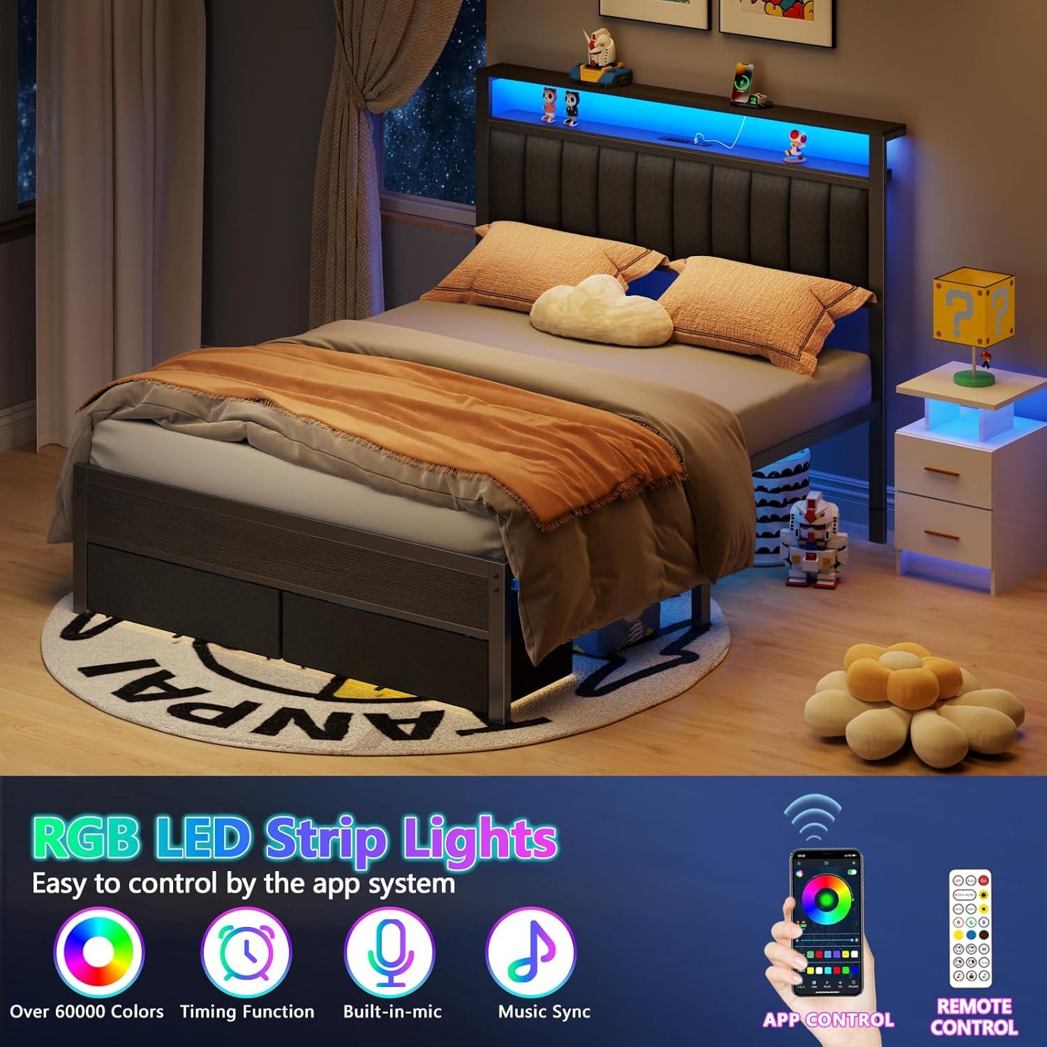 Furnulem Queen Bed Frame with Charging Station and LED Lights, Grey Upholstered Headboard with Shelves, Metal Platform Bed with 2 Under-Bed Storage (Fabric Drawer on Wheels), No Box Spring Needed(Queen)